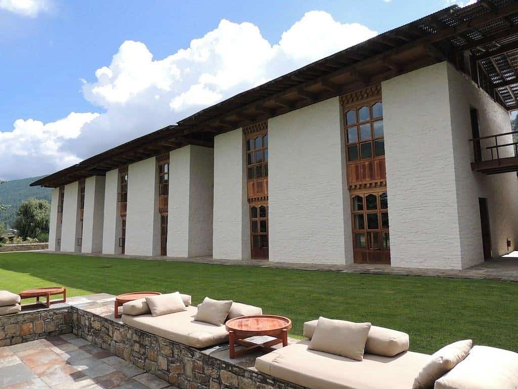 Son architecture minimaliste, inspirée des fermes traditionnelles bhoutanaises, crée une ambiance chaleureuse et intime. Le lodge propose 16 suites élégantes, équipées de poêles à bois et baignoires en pierre, offrant une vue paisible sur la nature environnante. Il dispose d’un spa holistique, d’un bain de vapeur traditionnel, et d’un restaurant raffiné, mettant à l’honneur les ingrédients locaux et biologiques.