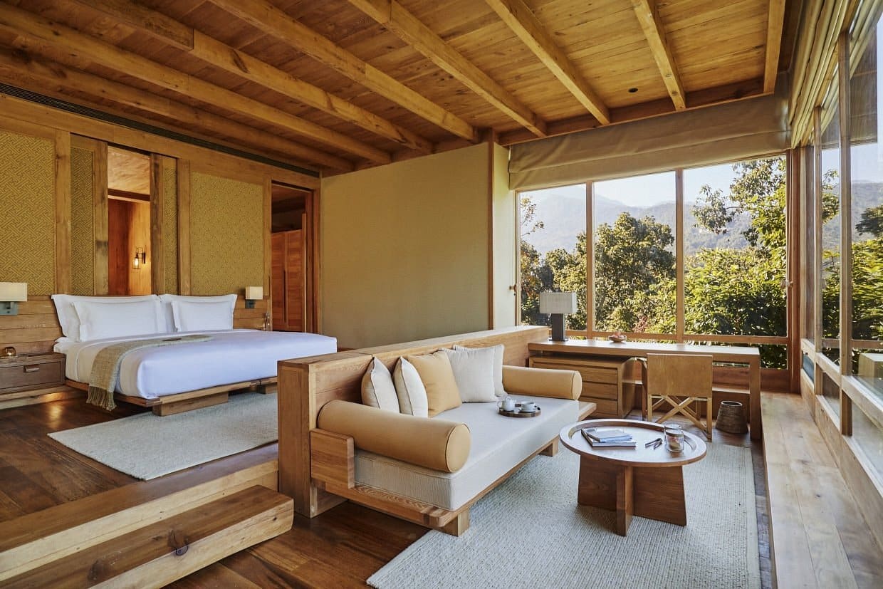 Surnommé le « Palais dans le Ciel », ce resort 5 étoiles propose 25 suites et villas spacieuses, avec une décoration élégante inspirée de l’architecture bhoutanaise et des vues spectaculaires sur la vallée. Il dispose d’un spa exceptionnel, d’une piscine intérieure chauffée, d’une salle de méditation et d’un restaurant gastronomique mettant en valeur les produits bio locaux. Le petit-déjeuner gourmand est préparé avec des ingrédients frais et nourrissants.