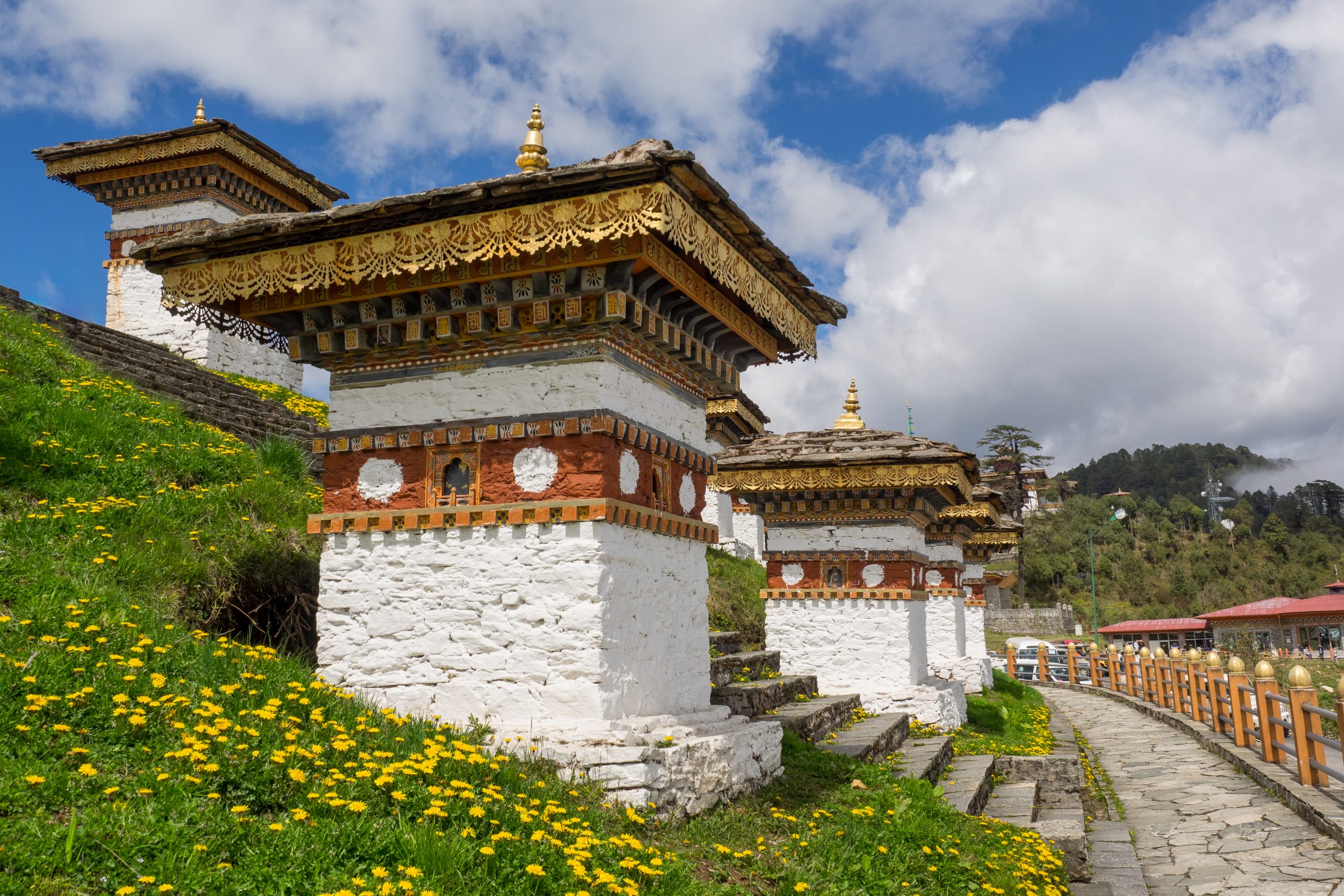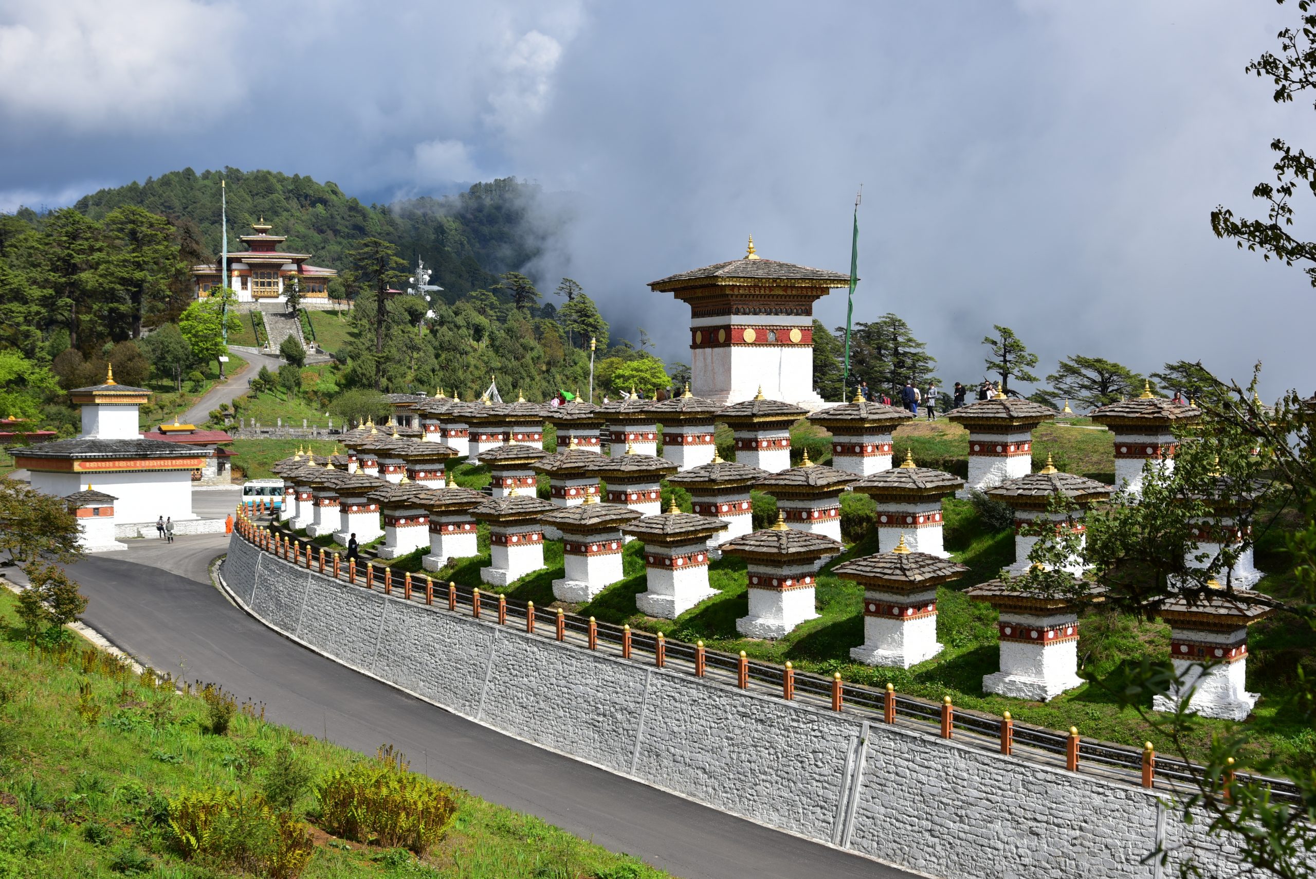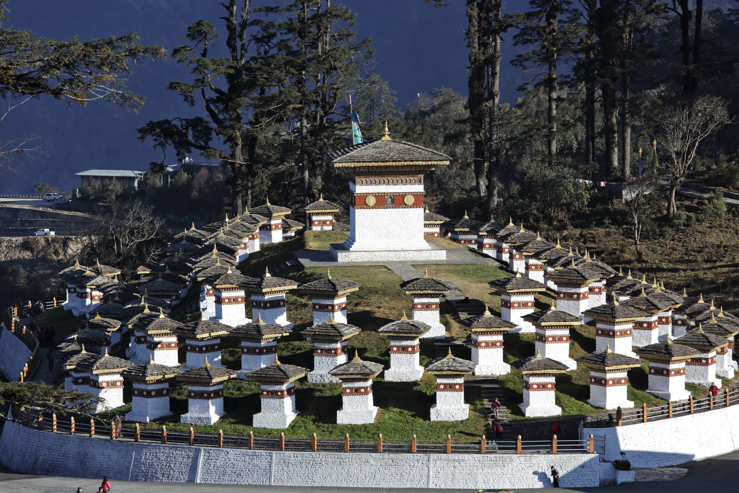 Le col de Dochula est situé à plus de 3150 mètres d’altitude sur la route menant de Thimphou à Punakha. Il n’est pas rare d’y trouver de la neige. Par temps clair, vous profiterez d’une vue panoramique majestueuse sur la chaîne de l’Himalaya. La construction des 108 chörtens (le chörten est le nom tibétain donné aux stupas bouddhiques) a été ordonnée par sa majesté la reine Ashi Dorji Wangmo Wangchuk en juin 2004, lorsque le roi est rentré à Thimphou après la guerre « Operation all Clear. » Ainsi, ces vestiges représentent un mémorial en l’honneur des soldats bhoutanais tués dans la bataille contre les insurgés Assamais de l’Inde. Le site surplombe la vallée et est devenu un lieu spirituel unique au Bhoutan. De nombreux rhododendrons ornent les alentours du col.